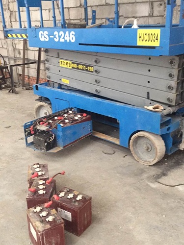自行式升降机的电瓶使用寿命一般为2~3,而新自行式升降机的原装电池多在3以上。但很多车主却因某些不当的操作习惯,会导致电瓶迅速没电。因此,电瓶保养不容忽视。这里惠和小编给一张更换蓄电池的现场图,希望大家能够进一步了解。